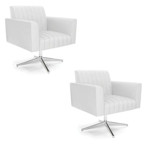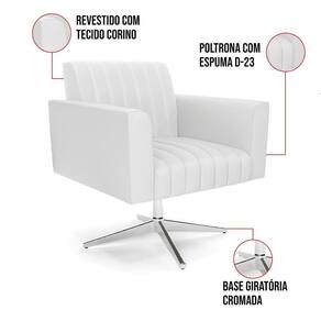 Quer uma decoração única e sofisticada? A Poltrona Viena é ideal para quem está em busca de um móvel versátil e diferenciado. Esse tipo de peça é ideal para ambientes modernos e descontraídos. Vem com uma ideia totalmente diferente, devido sua curva e forma suave, os detalhes gomados do tecido são tendências de decoração atuais. O tom Branco vem ganhando cada vez mais espaço no mercado, uma cor que traz elegância e combina com vários tipos de decoração. Uma dica legal de complemento é escolher almofadas que combinem com a poltrona. Sua estrutura é confeccionada em madeira de eucalipto proveniente de reflorestamento, o estofamento do assento é composto de espuma prorelax D-23 no encosto, e é revestido em Corino um tecido aconchegante, resistente e extremamente luxuoso. Sua sustentação é dada pela Base Base Giratória Cromada, suportando em média até 120 Kg. Crie um lindo efeito visual, em qualquer lugar da sua casa ou escritório! Garanta já seu Kit 2 Poltronas Viena.