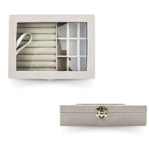 O interior do porta-joias é estrategicamente dividido em compartimentos para oferecer uma organização eficiente e prática. Essas divisórias são projetadas para acomodar diferentes tipos de joias, como anéis, brincos, pulseiras e colares, podendo ser removidas conforme o espaço que desejar. Dimensionada para manter as peças separadas, evitando emaranhado e facilitando o acesso rápido.