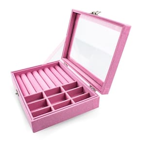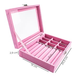 Nosso porta joias é um item organizador, encantador e prático, projetado para armazenar e organizar suas joias de maneira elegante, com sua tampa acrílica que permite visualizar todas as peças armazenadas dentro dele. Este delicado recipiente é revestido por dentro e por fora com veludo, proporcionando uma sensação suave ao toque e protegendo suas joias de arranhões e danos. O interior do porta-joias é estrategicamente dividido em compartimentos para oferecer uma organização eficiente e prática. Essas divisórias são projetadas para acomodar diferentes tipos de joias, como anéis, brincos, pulseiras e colares, podendo ser removidas conforme o espaço que desejar. Dimensionada para manter as peças separadas, evitando emaranhado e facilitando o acesso rápido. Oferece um design elegante para armários e penteadeiras, agregando a decoração, além de facilitar a organização e uso de suas peças.