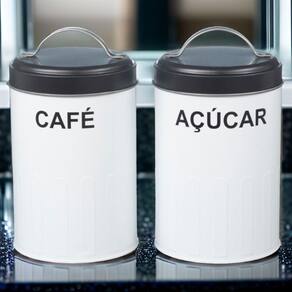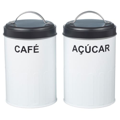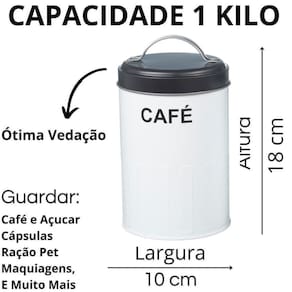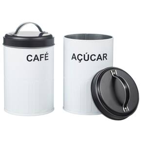 Cor: Branco com Tampa Preto Fosco Tamanho: 18cm de altura, 10cm de largura e 10cm de profundidade Material: Metal galvanizado com pintura Capacidade: 1 quilo por pote Quantidade: 2 unidades