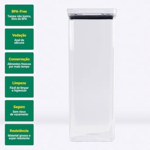 Com Capacidade de 2,2 Litros, o pote hermético quadrado é fabricado em Plástico resistente, um material leve e livre de BPA, garantindo segurança e durabilidade.
