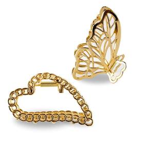 Ideal para todos os tipos de cabelo, uma tendencia que nunca sai de moda, pode ser combinado com diversos looks, desde os mais simples aos mais elegantes, utilizado para prender todo ou cabelo, ou apenas metade criando penteados versáteis para o dia a dia Feito com metal dourado resistente e forte, sua cor dourada não descasca. Prende o cabelo de forma segura, sem danificar o couro cabeludo ou os fios. A presilha de formato borboleta, trás delicadeza e elegância. As asas da borboleta são esculpidas com traços finos que formam várias partes de sua asa, criando um desenho incrível, já a no formato de coração esculpido por corretaria é um clássico simbolizando romantismo e delicadeza. O coração é suavemente arredondado e bem definido, com bordas similares a correntes de elos redondos.