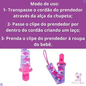 Além disso, o prendedor de chupetas Pietra Baby é compatível com a maioria dos modelos de chupetas, oferecendo versatilidade e praticidade. Ele pode ser preso à roupinha, no babador, na bolsa ou onde mais for conveniente para você e seu bebê.