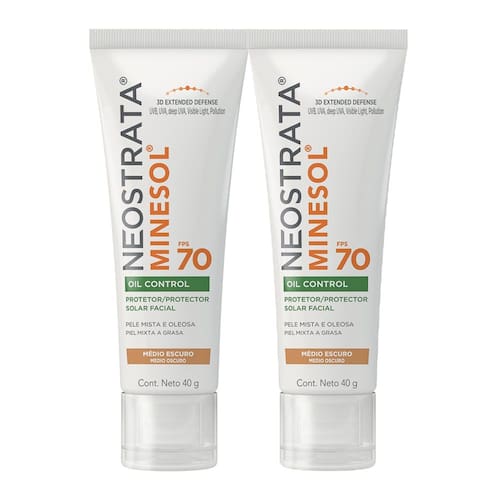 Protetor Solar Facial Neostrata Minesol Oil Control Médio Escuro FPS 70 40g Protetor solar facial com alta fixação e cobertura de longa duração, possui fórmula com Neoglucosamina, Feverfew e Vitamina E, corrigindo linhas finas e acelerando a renovação celular. Sua fórmula com cor possui tons especialmente desenvolvidos para a pele brasileira, em uma textura ultraleve e com efeito blur matificante, reduz a oleosidade com o uso contínuo. Controla o brilho por até 12 horas enquanto oferece proteção avançada contra raios UVB, UVA, UVA longo, protege contra a luz visível e poluição. Benefícios e diferenciais: -Tecnologia de proteção avançada 3D Extended Defense: UVB, UVA, UVA longo, protege contra a luz visível e poluição -Com Feverfew* + Vitamina E: poderosos antioxidantes, previnem e combatem os sinais de envelhecimento da pele -Com Neoglucosamina: que estimula a síntese de colágeno, corrige rugas e linhas finas com uso contínuo -Com Sepicontrol-A5: ativo regulador da oleosidade -Com microesferas absorvedoras: efeito matte duradouro -Efeito blur matificante: 12h de controle ativo e redução da oleosidade -Redução de até 86%** da oleosidade da pele em 28 dias -Corrige linhas finas e rugas***: pele mais lisa e uniforme -Gel creme com sensorial ultraleve: não derrete e não pesa -Alta fixação e cobertura de longa duração -Fragrância suave -Indicado para pele mista, pele oleosa e pele acneica -Dermatologicamente testado e não comedogênico