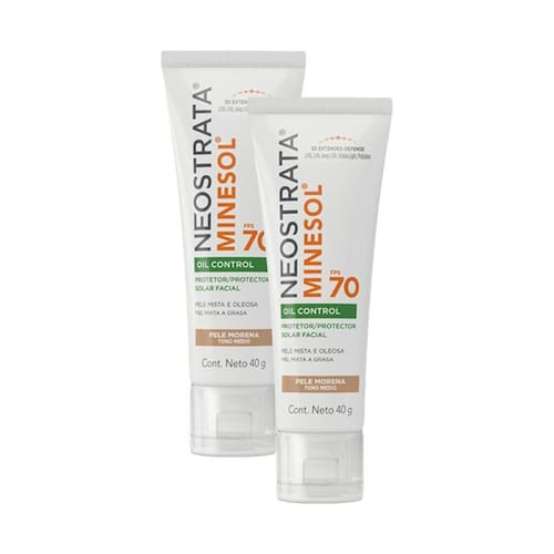 Kit 2 Protetor Solar Neostrata Minesol Oil Control FPS 70 Pele Morena 40g "Proteção solar diária com controle e redução da oleosidade da pele. Neostrata Minesol Oil Control FPS 70 é uma linha de proteção solar diária, que oferece alta proteção UVA/UVB e atua no controle imediato e prolongado da oleosidade da pele. Desenvolvido * Kit Contém: 2 Protetores Solar Neostrata Minesol Oil Control FPS 70 Pele Morena 40g cada * Compre produtos Neostrata