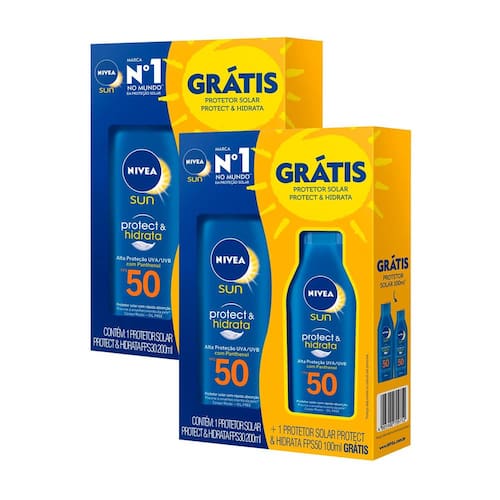 KIT PROTETOR SOLAR NIVEA SUN PROTECT & HIDRATA FPS 50 LOÇÃO Com Panthenol Com um sistema de filtro UVA/UVB, o Nivea Sun Protetor Solar Hidratante oferece proteção e previne o envelhecimento da pele. Sua exclusiva fórmula de rápida absorção e hidratação prolongada, combinada com Vitamina E, previne rugas e manchas causadas pela exposição/radiação solar. Textura leve. Rápida Absorção. Dermatologicamente testado. Resistente à água. Modo de usar: Aplique abundantemente antes da exposição ao sol. Reaplicar sempre, após sudorese intensa, nadar ou banhar-se, secar-se com toalha e durante a exposição ao sol. É necessária a reaplicação do produto para manter a sua efetividade. Se a quantidade aplicada não for adequada, o nível de proteção será significativamente reduzido. Ean: 4005900709752 Ean: 4005900709752
