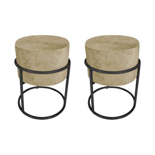 AS IMAGENS SÃO MERAMENTE ILUSTRATIVAS E PODEM SOFRER VARIAÇÕES DE COR E PEQUENOS DETALHES DE ACORDO COM O SEU MONITOR, ILUMINAÇÃO DO AMBIENTE E ATÉ MESMO A SUA PERCEPÇÃO VISUAL.Kit 2 Puffs Decorativos Redondo Base De Ferro Preta Tecido Veludo Bege