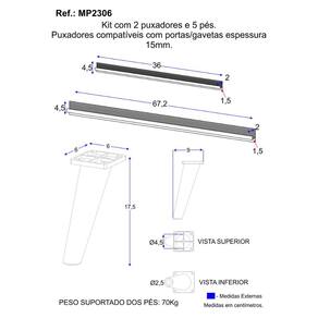 Dimensões do Produto: Puxador Gaveta - Altura: 4,5cm | Largura: 67,2cm | Profundidade: 2cm Puxador Porta - Altura: 4,5cm | Largura: 36cm | Profundidade: 2cm Pé - Altura: 17,5cm | Largura: 9cm | Profundidade: 6cm * Você pode consultar as medidas detalhadas na imagem técnica do produto. * Parafusos indicados para os puxadores: 3,5x12mm (7 unidades). * Parafusos indicados para os pés: 4x16mm (20 unidades) | 4x45mm (5 unidades).