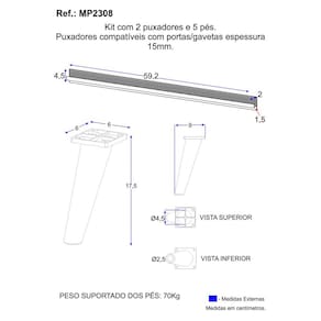Dimensões do Produto: Puxador - Altura: 4,5cm | Largura: 59,2cm | Profundidade: 2cm Pé - Altura: 17,5cm | Largura: 9cm | Profundidade: 6cm * Você pode consultar as medidas detalhadas na imagem técnica do produto. * Parafusos indicados para os puxadores: 3,5x12mm (6 unidades). * Parafusos indicados para os pés: 4x16mm (20 unidades) | 4x45mm (5 unidades).