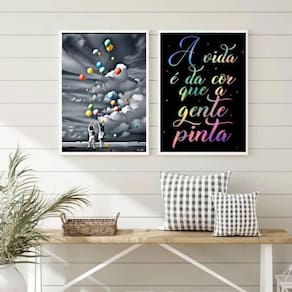 Kit 2 quadros a vida tem a cor que a gente pinta 24x18cm - com vidro Moldura: madeira branca Informações do produto tire todas as suas dúvidas no descritivo abaixo: decoração para quarto, sala, cozinha, escritório, área gourmet e muito mais. Chega de paredes vazias medidas - cada peça tem 24x18cm a5 . Material do papel - papel fotográfico brilhante de altíssima resolução acabamento - todos os quadros são acompanhados de vidro para proteção da imagem. - moldura em madeira maciça na cor preta ou branca conforme produto escolhido e pendurador . - os quadros são embalados de forma segura com plástico bolha com camada dupla de acordo com o tamanho dos quadros. Garantia - garantia de 3 meses. Meu quadro chegou. Como posso fixá-lo Você precisa apenas de um martelo e um prego, pois os quadros já vão acompanhados de penduradores. Esta é a forma mais indicada. Como posso limpar meu quadro A limpeza é feita como um móvel comum da sua casa. Apenas um pano seco ou espanador são suficientes para tal