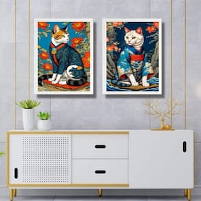 Kit 2 quadros arte oriental - gatos de kimono 45x34cm - com vidro Cor: moldura preta Informações do produto tire todas as suas dúvidas no descritivo abaixo: decoração para quarto, sala, cozinha, escritório, área gourmet e muito mais. Chega de paredes vazias medidas - cada peça tem 45x34cm a3 . Material do papel - papel fotográfico brilhante de altíssima resolução acabamento - todos os quadros são acompanhados de vidro para proteção da imagem. - moldura em madeira maciça na cor preta ou branca conforme produto escolhido e pendurador . - os quadros são embalados de forma segura com plástico bolha com camada dupla de acordo com o tamanho dos quadros. Garantia - garantia de 3 meses. Meu quadro chegou. Como posso fixá-lo Você precisa apenas de um martelo e um prego, pois os quadros já vão acompanhados de penduradores. Esta é a forma mais indicada. Como posso limpar meu quadro A limpeza é feita como um móvel comum da sua casa. Apenas um pano seco ou espanador são suficientes para tal