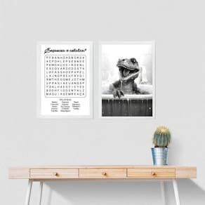 Kit 2 quadros banheiro infantil - dinossauro 24x18cm Moldura: madeira branca Informações do produto tire todas as suas dúvidas no descritivo abaixo: decoração para quarto, sala, cozinha, escritório, área gourmet e muito mais. Chega de paredes vazias medidas - cada peça tem 24x18cm a5 . Material do papel - papel fotográfico brilhante de altíssima resolução acabamento - todos os quadros são acompanhados de uma película de acetato para proteção da imagem. - os quadros são embalados de forma segura com plástico bolha com camada dupla de acordo com o tamanho dos quadros. Garantia - garantia de 3 meses. Meu quadro chegou. Como posso fixá-lo Você precisa apenas de um martelo e um prego, pois os quadros já vão acompanhados de penduradores. Esta é a forma mais indicada. Caso prefira, você pode utilizar uma fita dupla face neste caso, sugerimos de alta qualidade para evitar que descole e seu quadro caia . Como posso limpar meu quadro A limpeza é feita como um móvel comum da sua casa. Apenas um pano seco ou espanador são suficientes para tal