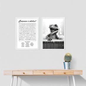 Kit 2 quadros banheiro infantil - dinossauro 45x34cm Moldura: madeira branca Informações do produto tire todas as suas dúvidas no descritivo abaixo: decoração para quarto, sala, cozinha, escritório, área gourmet e muito mais. Chega de paredes vazias. Medidas - cada peça tem 45x34cm a3 . Material do papel - papel fotográfico brilhante de altíssima resolução acabamento - todos os quadros são acompanhados de uma película de acetato para proteção da imagem. - os quadros são embalados de forma segura com plástico bolha com camada dupla de acordo com o tamanho dos quadros. - de 3 meses. Meu quadro chegou. Como posso fixá-lo Você precisa apenas de um martelo e um prego, pois os quadros já vão acompanhados de penduradores. Esta é a forma mais indicada. Caso prefira, você pode utilizar uma fita dupla face neste caso, sugerimos de alta qualidade para evitar que descole e seu quadro caia . Como posso limpar meu quadro A limpeza é feita como um móvel comum da sua casa. Apenas um pano seco ou espanador são suficientes para tal Marca: Não Informado