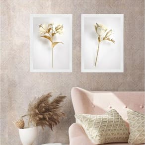 Kit 2 quadros branco e ouro - simple flowers 24x18cm Moldura: madeira branca Informações do produto tire todas as suas dúvidas no descritivo abaixo: decoração para quarto, sala, cozinha, escritório, área gourmet e muito mais. Chega de paredes vazias medidas - cada peça tem 24x18cm a5 . Material do papel - papel fotográfico brilhante de altíssima resolução acabamento - todos os quadros são acompanhados de uma película de acetato para proteção da imagem. - os quadros são embalados de forma segura com plástico bolha com camada dupla de acordo com o tamanho dos quadros. Garantia - garantia de 3 meses. Meu quadro chegou. Como posso fixá-lo Você precisa apenas de um martelo e um prego, pois os quadros já vão acompanhados de penduradores. Esta é a forma mais indicada. Caso prefira, você pode utilizar uma fita dupla face neste caso, sugerimos de alta qualidade para evitar que descole e seu quadro caia . Como posso limpar meu quadro A limpeza é feita como um móvel comum da sua casa. Apenas um pano seco ou espanador são suficientes para tal