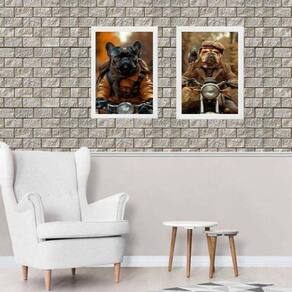 Kit 2 quadros cães motociclistas 45x34cm - com vidro Moldura: madeira preta Informações do produto tire todas as suas dúvidas no descritivo abaixo: decoração para quarto, sala, cozinha, escritório, área gourmet e muito mais. Chega de paredes vazias medidas - cada peça tem 45x34cm a3 . Material do papel - papel fotográfico brilhante de altíssima resolução acabamento - todos os quadros são acompanhados de vidro para proteção da imagem. - moldura em madeira maciça na cor preta ou branca conforme produto escolhido e pendurador . - os quadros são embalados de forma segura com plástico bolha com camada dupla de acordo com o tamanho dos quadros. Garantia - garantia de 3 meses. Meu quadro chegou. Como posso fixá-lo Você precisa apenas de um martelo e um prego, pois os quadros já vão acompanhados de penduradores. Esta é a forma mais indicada. Como posso limpar meu quadro A limpeza é feita como um móvel comum da sua casa. Apenas um pano seco ou espanador são suficientes para tal