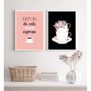 Kit 2 quadros cantinho do café- preto e rosa 45x34cm - com vidro Moldura: madeira branca Informações do produto tire todas as suas dúvidas no descritivo abaixo: decoração para quarto, sala, cozinha, escritório, área gourmet e muito mais. Chega de paredes vazias medidas - cada peça tem 45x34cm a3 . Material do papel - papel fotográfico brilhante de altíssima resolução acabamento - todos os quadros são acompanhados de vidro para proteção da imagem. - moldura em madeira maciça na cor preta ou branca conforme produto escolhido e pendurador . - os quadros são embalados de forma segura com plástico bolha com camada dupla de acordo com o tamanho dos quadros. Garantia - garantia de 3 meses. Meu quadro chegou. Como posso fixá-lo Você precisa apenas de um martelo e um prego, pois os quadros já vão acompanhados de penduradores. Esta é a forma mais indicada. Como posso limpar meu quadro A limpeza é feita como um móvel comum da sua casa. Apenas um pano seco ou espanador são suficientes para tal Ean: 7899759540065