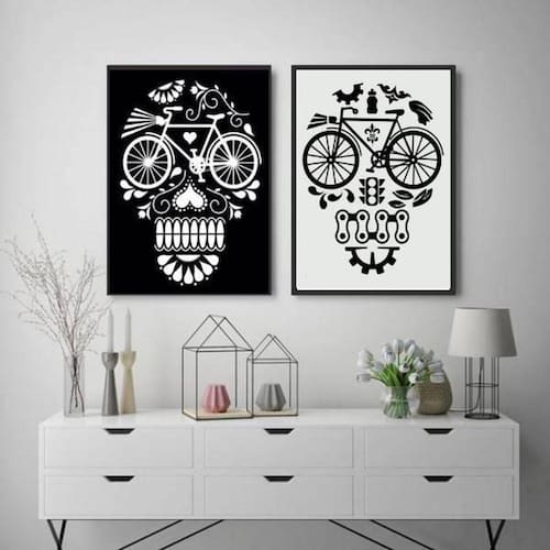 Kit 2 quadros caveiras bicicletas 45x34cm Moldura: madeira preta Informações do produto tire todas as suas dúvidas no descritivo abaixo: decoração para quarto, sala, cozinha, escritório, área gourmet e muito mais. Chega de paredes vazias medidas - cada peça tem 45x34cm a3 . Material do papel - papel fotográfico brilhante de altíssima resolução acabamento - todos os quadros são acompanhados de uma película de acetato para proteção da imagem. - moldura em madeira maciça na cor preta e pendurador móvel que pode ser retirado facilmente caso deseje fixar com fita dupla face. - os quadros são embalados de forma segura com plástico bolha com camada dupla de acordo com o tamanho dos quadros. Garantia - garantia de 3 meses. Meu quadro chegou. Como posso fixá-lo Você precisa apenas de um martelo e um prego, pois os quadros já vão acompanhados de penduradores. Esta é a forma mais indicada. Caso prefira, você pode utilizar uma fita dupla face neste caso, sugerimos de alta qualidade para evitar que descole e seu quadro caia . Como posso limpar meu quadro A limpeza é feita como um móvel comum da sua casa. Apenas um pano seco ou espanador são suficientes para tal