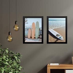 Kit 2 quadros coleção praia - surf 33x24cm - com vidro Moldura: madeira branca Informações do produto tire todas as suas dúvidas no descritivo abaixo: decoração para quarto, sala, cozinha, escritório, área gourmet e muito mais. Chega de paredes vazias medidas - cada peça tem 33x24cm a4 . Material do papel - papel fotográfico brilhante de altíssima resolução acabamento - todos os quadros são acompanhados de vidro para proteção da imagem. - moldura em madeira maciça na cor preta ou branca conforme produto escolhido e pendurador . - os quadros são embalados de forma segura com plástico bolha com camada dupla de acordo com o tamanho dos quadros. Garantia - garantia de 3 meses. Meu quadro chegou. Como posso fixá-lo Você precisa apenas de um martelo e um prego, pois os quadros já vão acompanhados de penduradores. Esta é a forma mais indicada. Como posso limpar meu quadro A limpeza é feita como um móvel comum da sua casa. Apenas um pano seco ou espanador são suficientes para tal