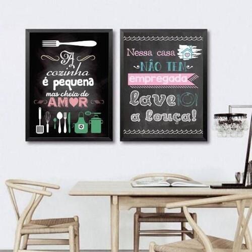 Kit 2 quadros cozinha pequena - lave a louça 45x34cm - com vidro Moldura: madeira branca Informações do produto tire todas as suas dúvidas no descritivo abaixo: decoração para quarto, sala, cozinha, escritório, área gourmet e muito mais. Chega de paredes vazias medidas - cada peça tem 45x34cm a3 . Material do papel - papel fotográfico brilhante de altíssima resolução acabamento - todos os quadros são acompanhados de vidro para proteção da imagem. - moldura em madeira maciça na cor preta ou branca conforme produto escolhido e pendurador . - os quadros são embalados de forma segura com plástico bolha com camada dupla de acordo com o tamanho dos quadros. Garantia - garantia de 3 meses. Meu quadro chegou. Como posso fixá-lo Você precisa apenas de um martelo e um prego, pois os quadros já vão acompanhados de penduradores. Esta é a forma mais indicada. Como posso limpar meu quadro A limpeza é feita como um móvel comum da sua casa. Apenas um pano seco ou espanador são suficientes para tal