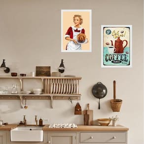Kit 2 quadros cozinha vintage pin up 24x18cm - com vidro Moldura: madeira branca Informações do produto tire todas as suas dúvidas no descritivo abaixo: decoração para quarto, sala, cozinha, escritório, área gourmet e muito mais. Chega de paredes vazias medidas - cada peça tem 24x18cm a5 . Material do papel - papel fotográfico brilhante de altíssima resolução acabamento - todos os quadros são acompanhados de vidro para proteção da imagem. - moldura em madeira maciça na cor preta ou branca conforme produto escolhido e pendurador . - os quadros são embalados de forma segura com plástico bolha com camada dupla de acordo com o tamanho dos quadros. Garantia - garantia de 3 meses. Meu quadro chegou. Como posso fixá-lo Você precisa apenas de um martelo e um prego, pois os quadros já vão acompanhados de penduradores. Esta é a forma mais indicada. Como posso limpar meu quadro A limpeza é feita como um móvel comum da sua casa. Apenas um pano seco ou espanador são suficientes para tal