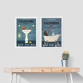 Kit 2 quadros de banheiro cão dachshund 45x34cm - com vidro Moldura: madeira preta Informações do produto tire todas as suas dúvidas no descritivo abaixo: decoração para quarto, sala, cozinha, escritório, área gourmet e muito mais. Chega de paredes vazias medidas - cada peça tem 45x34cm a3 . Material do papel - papel fotográfico brilhante de altíssima resolução acabamento - todos os quadros são acompanhados de vidro para proteção da imagem. - moldura em madeira maciça na cor preta ou branca conforme produto escolhido e pendurador . - os quadros são embalados de forma segura com plástico bolha com camada dupla de acordo com o tamanho dos quadros. Garantia - garantia de 3 meses. Meu quadro chegou. Como posso fixá-lo Você precisa apenas de um martelo e um prego, pois os quadros já vão acompanhados de penduradores. Esta é a forma mais indicada. Como posso limpar meu quadro A limpeza é feita como um móvel comum da sua casa. Apenas um pano seco ou espanador são suficientes para tal