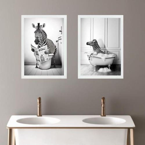 Kit 2 quadros para decorar banheiro - zebrinha 33x24cm - com vidro Moldura: madeira preta Informações do produto tire todas as suas dúvidas no descritivo abaixo: decoração para quarto, sala, cozinha, escritório, área gourmet e muito mais. Chega de paredes vazias medidas - cada peça tem 33x24cm a4 . Material do papel - papel fotográfico brilhante de altíssima resolução acabamento - todos os quadros são acompanhados de vidro para proteção da imagem. - moldura em madeira maciça na cor preta ou branca conforme produto escolhido e pendurador . - os quadros são embalados de forma segura com plástico bolha com camada dupla de acordo com o tamanho dos quadros. Garantia - garantia de 3 meses. Meu quadro chegou. Como posso fixá-lo Você precisa apenas de um martelo e um prego, pois os quadros já vão acompanhados de penduradores. Esta é a forma mais indicada. Como posso limpar meu quadro A limpeza é feita como um móvel comum da sua casa. Apenas um pano seco ou espanador são suficientes para tal