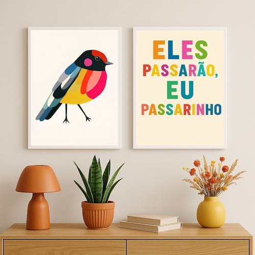 Kit 2 Quadros Decorativos Eles Passarão Eu Passarinho 33x24cm - com vidro - Cor: Moldura branca