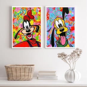 O Kit 2 Quadros Decorativos Grafite Pluto Pateta é perfeito para dar um toque especial à decoração do seu quarto, sala, cozinha, escritório, área gourmet e muito mais. Chega de paredes vazias! Cada peça possui as medidas de 45x34cm A3 , sendo ideal para compor qualquer ambiente.