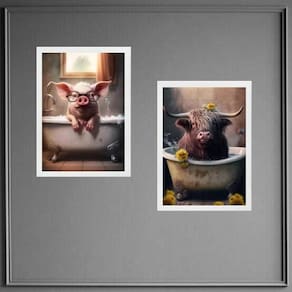 Kit 2 quadros divertidos banheiro - porco e boi 24x18cm Moldura: madeira branca Informações do produto tire todas as suas dúvidas no descritivo abaixo: decoração para quarto, sala, cozinha, escritório, área gourmet e muito mais. Chega de paredes vazias medidas - cada peça tem 24x18cm a5 . Material do papel - papel fotográfico brilhante de altíssima resolução acabamento - todos os quadros são acompanhados de uma película de acetato para proteção da imagem. - os quadros são embalados de forma segura com plástico bolha com camada dupla de acordo com o tamanho dos quadros. Garantia - garantia de 3 meses. Meu quadro chegou. Como posso fixá-lo Você precisa apenas de um martelo e um prego, pois os quadros já vão acompanhados de penduradores. Esta é a forma mais indicada. Caso prefira, você pode utilizar uma fita dupla face neste caso, sugerimos de alta qualidade para evitar que descole e seu quadro caia . Como posso limpar meu quadro A limpeza é feita como um móvel comum da sua casa. Apenas um pano seco ou espanador são suficientes para tal