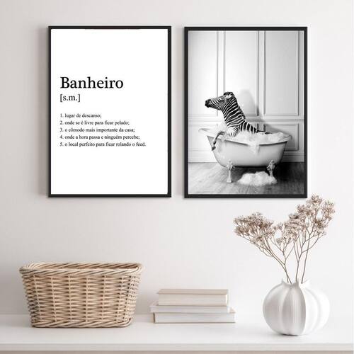 Kit 2 quadros divertidos banheiro - zebra 33x24cm Moldura: madeira preta Informações do produto tire todas as suas dúvidas no descritivo abaixo: decoração para quarto, sala, cozinha, escritório, área gourmet e muito mais. Chega de paredes vazias medidas - cada peça tem 33x24cm a4 . Material do papel - papel fotográfico brilhante de altíssima resolução acabamento - todos os quadros são acompanhados de uma película de acetato para proteção da imagem. - os quadros são embalados de forma segura com plástico bolha com camada dupla de acordo com o tamanho dos quadros. Garantia - garantia de 3 meses. Meu quadro chegou. Como posso fixá-lo Você precisa apenas de um martelo e um prego, pois os quadros já vão acompanhados de penduradores. Esta é a forma mais indicada. Caso prefira, você pode utilizar uma fita dupla face neste caso, sugerimos de alta qualidade para evitar que descole e seu quadro caia . Como posso limpar meu quadro A limpeza é feita como um móvel comum da sua casa. Apenas um pano seco ou espanador são suficientes para tal