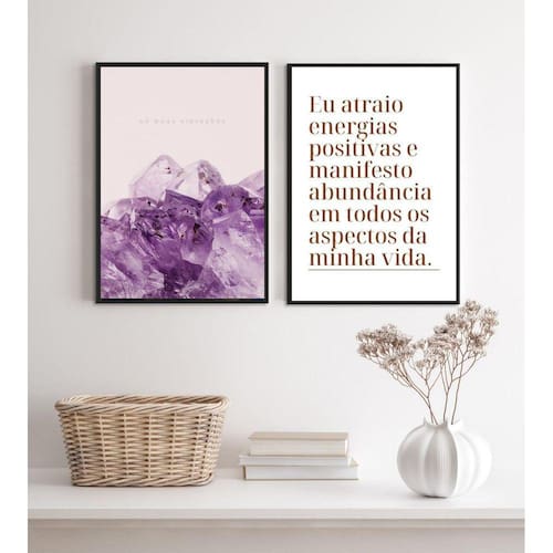 Kit 2 quadros energias positivas- cristais abundância 24x18cm - com vidro Moldura: madeira branca Informações do produto tire todas as suas dúvidas no descritivo abaixo: decoração para quarto, sala, cozinha, escritório, área gourmet e muito mais. Chega de paredes vazias medidas - cada peça tem 24x18cm a5 . Material do papel - papel fotográfico brilhante de altíssima resolução acabamento - todos os quadros são acompanhados de vidro para proteção da imagem. - moldura em madeira maciça na cor preta ou branca conforme produto escolhido e pendurador . - os quadros são embalados de forma segura com plástico bolha com camada dupla de acordo com o tamanho dos quadros. Garantia - garantia de 3 meses. Meu quadro chegou. Como posso fixá-lo Você precisa apenas de um martelo e um prego, pois os quadros já vão acompanhados de penduradores. Esta é a forma mais indicada. Como posso limpar meu quadro A limpeza é feita como um móvel comum da sua casa. Apenas um pano seco ou espanador são suficientes para tal Ean: 7899960007562