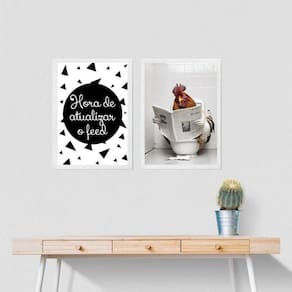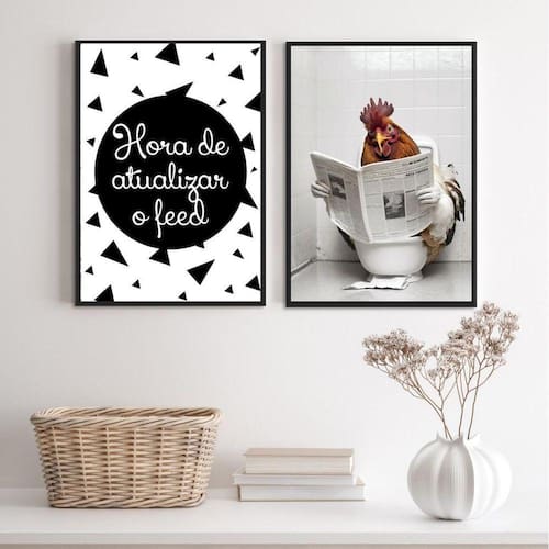 Kit 2 quadros engraçados banheiro - galo 24x18cm - com vidro Moldura: madeira preta Informações do produto tire todas as suas dúvidas no descritivo abaixo: decoração para quarto, sala, cozinha, escritório, área gourmet e muito mais. Chega de paredes vazias medidas - cada peça tem 24x18cm a5 . Material do papel - papel fotográfico brilhante de altíssima resolução acabamento - todos os quadros são acompanhados de vidro para proteção da imagem. - moldura em madeira maciça na cor preta ou branca conforme produto escolhido e pendurador . - os quadros são embalados de forma segura com plástico bolha com camada dupla de acordo com o tamanho dos quadros. Garantia - garantia de 3 meses. Meu quadro chegou. Como posso fixá-lo Você precisa apenas de um martelo e um prego, pois os quadros já vão acompanhados de penduradores. Esta é a forma mais indicada. Como posso limpar meu quadro A limpeza é feita como um móvel comum da sua casa. Apenas um pano seco ou espanador são suficientes para tal