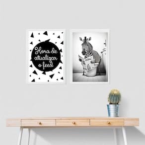 Kit 2 quadros engraçados banheiro - zebra 24x18cm Moldura: madeira branca Informações do produto tire todas as suas dúvidas no descritivo abaixo: decoração para quarto, sala, cozinha, escritório, área gourmet e muito mais. Chega de paredes vazias medidas - cada peça tem 24x18cm a5 . Material do papel - papel fotográfico brilhante de altíssima resolução acabamento - todos os quadros são acompanhados de uma película de acetato para proteção da imagem. - os quadros são embalados de forma segura com plástico bolha com camada dupla de acordo com o tamanho dos quadros. Garantia - garantia de 3 meses. Meu quadro chegou. Como posso fixá-lo Você precisa apenas de um martelo e um prego, pois os quadros já vão acompanhados de penduradores. Esta é a forma mais indicada. Caso prefira, você pode utilizar uma fita dupla face neste caso, sugerimos de alta qualidade para evitar que descole e seu quadro caia . Como posso limpar meu quadro A limpeza é feita como um móvel comum da sua casa. Apenas um pano seco ou espanador são suficientes para tal