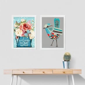 Kit 2 quadros flores e passarinho - welcome 24x18cm - com vidro Moldura: madeira branca Informações do produto tire todas as suas dúvidas no descritivo abaixo: decoração para quarto, sala, cozinha, escritório, área gourmet e muito mais. Chega de paredes vazias medidas - cada peça tem 24x18cm a5 . Material do papel - papel fotográfico brilhante de altíssima resolução acabamento - todos os quadros são acompanhados de vidro para proteção da imagem. - moldura em madeira maciça na cor preta ou branca conforme produto escolhido e pendurador . - os quadros são embalados de forma segura com plástico bolha com camada dupla de acordo com o tamanho dos quadros. Garantia - garantia de 3 meses. Meu quadro chegou. Como posso fixá-lo Você precisa apenas de um martelo e um prego, pois os quadros já vão acompanhados de penduradores. Esta é a forma mais indicada. Como posso limpar meu quadro A limpeza é feita como um móvel comum da sua casa. Apenas um pano seco ou espanador são suficientes para tal