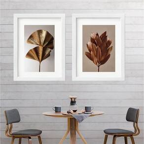 Kit 2 quadros folhagem bronze - 60x48cm Moldura: madeira branca Informações do produto tire todas as suas dúvidas no descritivo abaixo: decoração para quarto, sala, cozinha, escritório, área gourmet e muito mais. Chega de paredes vazias medidas - cada peça tem 60x48cm . Material do papel - papel fotográfico brilhante de altíssima resolução acabamento - todos os quadros são acompanhados de vidro para proteção da imagem. - moldura em madeira maciça na cor branca e pendurador. - paspatur branco com 7cm de largura - os quadros são embalados de forma segura com plástico bolha com camada dupla de acordo com o tamanho dos quadros. Garantia - garantia de 3 meses. Meu quadro chegou. Como posso fixá-lo Você precisa apenas de um martelo e um prego, pois os quadros já vão acompanhados de penduradores. Esta é a forma mais indicada. Como posso limpar meu quadro A limpeza é feita como um móvel comum da sua casa. Apenas um pano seco ou espanador são suficientes para tal Cor: moldura branca