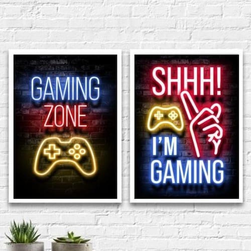 Kit 2 quadros gaming zone 24x18cm Moldura: madeira branca Informações do produto tire todas as suas dúvidas no descritivo abaixo: decoração para quarto, sala, cozinha, escritório, área gourmet e muito mais. Chega de paredes vazias medidas - cada peça tem 24x18cm a5 . Material do papel - papel fotográfico brilhante de altíssima resolução acabamento - todos os quadros são acompanhados de uma película de acetato para proteção da imagem. - moldura em madeira maciça na cor preta e pendurador móvel que pode ser retirado facilmente caso deseje fixar com fita dupla face. - os quadros são embalados de forma segura com plástico bolha com camada dupla de acordo com o tamanho dos quadros. Garantia - garantia de 3 meses. Meu quadro chegou. Como posso fixá-lo Você precisa apenas de um martelo e um prego, pois os quadros já vão acompanhados de penduradores. Esta é a forma mais indicada. Caso prefira, você pode utilizar uma fita dupla face neste caso, sugerimos de alta qualidade para evitar que descole e seu quadro caia . Como posso limpar meu quadro A limpeza é feita como um móvel comum da sua casa. Apenas um pano seco ou espanador são suficientes para tal