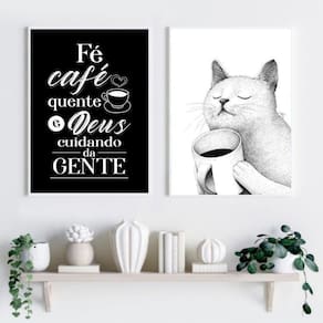 Kit 2 quadros gatinho café amor e fé 45x34cm - com vidro Moldura: madeira branca Informações do produto tire todas as suas dúvidas no descritivo abaixo: decoração para quarto, sala, cozinha, escritório, área gourmet e muito mais. Chega de paredes vazias medidas - cada peça tem 45x34cm a3 . Material do papel - papel fotográfico brilhante de altíssima resolução acabamento - todos os quadros são acompanhados de vidro para proteção da imagem. - moldura em madeira maciça na cor preta ou branca conforme produto escolhido e pendurador . - os quadros são embalados de forma segura com plástico bolha com camada dupla de acordo com o tamanho dos quadros. Garantia - garantia de 3 meses. Meu quadro chegou. Como posso fixá-lo Você precisa apenas de um martelo e um prego, pois os quadros já vão acompanhados de penduradores. Esta é a forma mais indicada. Como posso limpar meu quadro A limpeza é feita como um móvel comum da sua casa. Apenas um pano seco ou espanador são suficientes para tal