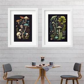 Kit 2 quadros grandes cogumelos - 60x48cm Moldura: madeira branca Informações do produto tire todas as suas dúvidas no descritivo abaixo: decoração para quarto, sala, cozinha, escritório, área gourmet e muito mais. Chega de paredes vazias medidas - cada peça tem 60x48cm . Material do papel - papel fotográfico brilhante de altíssima resolução acabamento - todos os quadros são acompanhados de vidro para proteção da imagem. - moldura em madeira maciça na cor preta ou branca conforme produto escolhido e pendurador. - paspatur branco com 7cm de largura - os quadros são embalados de forma segura com plástico bolha com camada dupla de acordo com o tamanho dos quadros. Garantia - garantia de 3 meses. Meu quadro chegou. Como posso fixá-lo Você precisa apenas de um martelo e um prego, pois os quadros já vão acompanhados de penduradores. Esta é a forma mais indicada. Como posso limpar meu quadro A limpeza é feita como um móvel comum da sua casa. Apenas um pano seco ou espanador são suficientes para tal Ean: 7898211073349