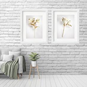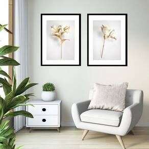 Kit 2 quadros grandes flores branca dourado - 60x48cm Moldura: madeira branca Informações do produto tire todas as suas dúvidas no descritivo abaixo: decoração para quarto, sala, cozinha, escritório, área gourmet e muito mais. Chega de paredes vazias medidas - cada peça tem 60x48cm . Material do papel - papel fotográfico brilhante de altíssima resolução acabamento - todos os quadros são acompanhados de vidro para proteção da imagem. - moldura em madeira maciça na cor preta ou branca conforme produto escolhido e pendurador. - paspatur branco com 7cm de largura - os quadros são embalados de forma segura com plástico bolha com camada dupla de acordo com o tamanho dos quadros. - de 3 meses. Meu quadro chegou. Como posso fixá-lo Você precisa apenas de um martelo e um prego, pois os quadros já vão acompanhados de penduradores. Esta é a forma mais indicada. Como posso limpar meu quadro A limpeza é feita como um móvel comum da sua casa. Apenas um pano seco ou espanador são suficientes para tal Marca: Não Informado Ean: 7897765356724