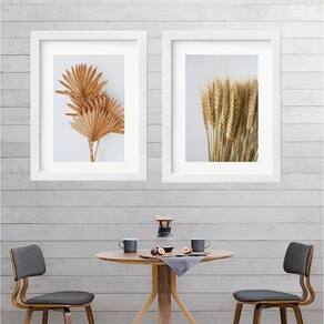 Kit 2 quadros grandes folhas secas - 60x48cm Moldura: madeira branca Informações do produto tire todas as suas dúvidas no descritivo abaixo: decoração para quarto, sala, cozinha, escritório, área gourmet e muito mais. Chega de paredes vazias medidas - cada peça tem 60x48cm . Material do papel - papel fotográfico brilhante de altíssima resolução acabamento - todos os quadros são acompanhados de vidro para proteção da imagem. - moldura em madeira maciça na cor preta ou branca conforme produto escolhido e pendurador. - paspatur branco com 7cm de largura - os quadros são embalados de forma segura com plástico bolha com camada dupla de acordo com o tamanho dos quadros. Garantia - garantia de 3 meses. Meu quadro chegou. Como posso fixá-lo Você precisa apenas de um martelo e um prego, pois os quadros já vão acompanhados de penduradores. Esta é a forma mais indicada. Como posso limpar meu quadro A limpeza é feita como um móvel comum da sua casa. Apenas um pano seco ou espanador são suficientes para tal
