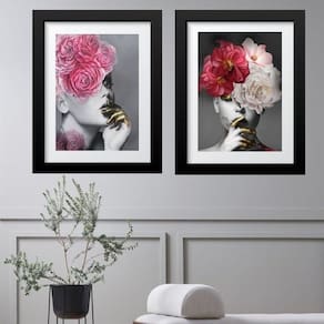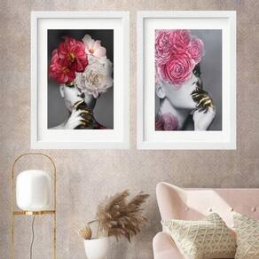 Kit 2 quadros grandes mulher flores - 60x48cm Moldura: madeira branca Informações do produto tire todas as suas dúvidas no descritivo abaixo: decoração para quarto, sala, cozinha, escritório, área gourmet e muito mais. Chega de paredes vazias medidas - cada peça tem 60x48cm . Material do papel - papel fotográfico brilhante de altíssima resolução acabamento - todos os quadros são acompanhados de vidro para proteção da imagem. - moldura em madeira maciça na cor preta ou branca conforme produto escolhido e pendurador. - paspatur branco com 7cm de largura - os quadros são embalados de forma segura com plástico bolha com camada dupla de acordo com o tamanho dos quadros. Garantia - garantia de 3 meses. Meu quadro chegou. Como posso fixá-lo Você precisa apenas de um martelo e um prego, pois os quadros já vão acompanhados de penduradores. Esta é a forma mais indicada. Como posso limpar meu quadro A limpeza é feita como um móvel comum da sua casa. Apenas um pano seco ou espanador são suficientes para tal