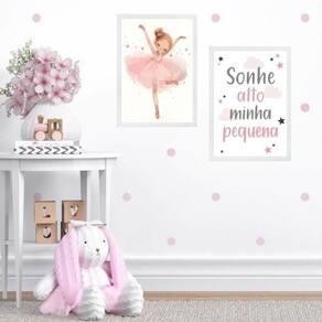 Kit 2 quadros infantis bailarina - sonhe alto 33x24cm - com vidro Moldura: madeira branca Informações do produto tire todas as suas dúvidas no descritivo abaixo: decoração para quarto, sala, cozinha, escritório, área gourmet e muito mais. Chega de paredes vazias medidas - cada peça tem 33x24cm a4 . Material do papel - papel fotográfico brilhante de altíssima resolução acabamento - todos os quadros são acompanhados de vidro para proteção da imagem. - moldura em madeira maciça na cor preta ou branca conforme produto escolhido e pendurador . - os quadros são embalados de forma segura com plástico bolha com camada dupla de acordo com o tamanho dos quadros. Garantia - garantia de 3 meses. Meu quadro chegou. Como posso fixá-lo Você precisa apenas de um martelo e um prego, pois os quadros já vão acompanhados de penduradores. Esta é a forma mais indicada. Como posso limpar meu quadro A limpeza é feita como um móvel comum da sua casa. Apenas um pano seco ou espanador são suficientes para tal