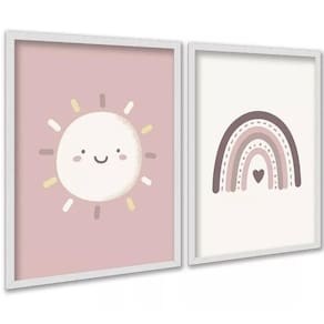 Kit 2 quadros infantis sol e arco-íris rosê 33x24cm - com vidro Cor: moldura preta Informações do produto tire todas as suas dúvidas no descritivo abaixo: decoração para quarto, sala, cozinha, escritório, área gourmet e muito mais. Chega de paredes vazias medidas - cada peça tem 33x24cm a4 . Material do papel - papel fotográfico brilhante de altíssima resolução acabamento - todos os quadros são acompanhados de vidro para proteção da imagem. - moldura em madeira maciça na cor preta ou branca conforme produto escolhido e pendurador . - os quadros são embalados de forma segura com plástico bolha com camada dupla de acordo com o tamanho dos quadros. - de 3 meses. Meu quadro chegou. Como posso fixá-lo Você precisa apenas de um martelo e um prego, pois os quadros já vão acompanhados de penduradores. Esta é a forma mais indicada. Como posso limpar meu quadro A limpeza é feita como um móvel comum da sua casa. Apenas um pano seco ou espanador são suficientes para tal