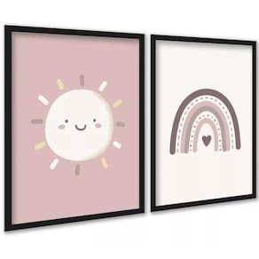 Kit 2 quadros infantis sol e arco-íris rosê 33x24cm Cor: moldura preta Informações do produto tire todas as suas dúvidas no descritivo abaixo: decoração para quarto, sala, cozinha, escritório, área gourmet e muito mais. Chega de paredes vazias medidas - cada peça tem 33x24cm a4 . Material do papel - papel fotográfico brilhante de altíssima resolução acabamento - todos os quadros são acompanhados de uma película de acetato para proteção da imagem. - os quadros são embalados de forma segura com plástico bolha com camada dupla de acordo com o tamanho dos quadros. - de 3 meses. Meu quadro chegou. Como posso fixá-lo Você precisa apenas de um martelo e um prego, pois os quadros já vão acompanhados de penduradores. Esta é a forma mais indicada. Caso prefira, você pode utilizar uma fita dupla face neste caso, sugerimos de alta qualidade para evitar que descole e seu quadro caia . Como posso limpar meu quadro A limpeza é feita como um móvel comum da sua casa. Apenas um pano seco ou espanador são suficientes para tal