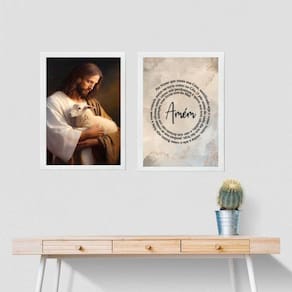 Kit 2 quadros jesus com ovelha - pai nosso 45x34cm Moldura: madeira preta Informações do produto tire todas as suas dúvidas no descritivo abaixo: decoração para quarto, sala, cozinha, escritório, área gourmet e muito mais. Chega de paredes vazias. Medidas - cada peça tem 45x34cm a3 . Material do papel - papel fotográfico brilhante de altíssima resolução acabamento - todos os quadros são acompanhados de uma película de acetato para proteção da imagem. - os quadros são embalados de forma segura com plástico bolha com camada dupla de acordo com o tamanho dos quadros. Garantia - garantia de 3 meses. Meu quadro chegou. Como posso fixá-lo Você precisa apenas de um martelo e um prego, pois os quadros já vão acompanhados de penduradores. Esta é a forma mais indicada. Caso prefira, você pode utilizar uma fita dupla face neste caso, sugerimos de alta qualidade para evitar que descole e seu quadro caia . Como posso limpar meu quadro A limpeza é feita como um móvel comum da sua casa. Apenas um pano seco ou espanador são suficientes para tal