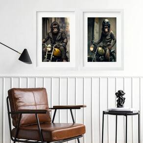 Kit 2 quadros macacos motoqueiros - 60x48cm Moldura: madeira branca Informações do produto tire todas as suas dúvidas no descritivo abaixo: decoração para quarto, sala, cozinha, escritório, área gourmet e muito mais. Chega de paredes vazias medidas - cada peça tem 60x48cm . Material do papel - papel fotográfico brilhante de altíssima resolução acabamento - todos os quadros são acompanhados de vidro para proteção da imagem. - moldura em madeira maciça na cor preta ou branca conforme produto escolhido e pendurador. - paspatur branco com 7cm de largura - os quadros são embalados de forma segura com plástico bolha com camada dupla de acordo com o tamanho dos quadros. - de 3 meses. Meu quadro chegou. Como posso fixá-lo Você precisa apenas de um martelo e um prego, pois os quadros já vão acompanhados de penduradores. Esta é a forma mais indicada. Como posso limpar meu quadro A limpeza é feita como um móvel comum da sua casa. Apenas um pano seco ou espanador são suficientes para tal Marca: Não Informado