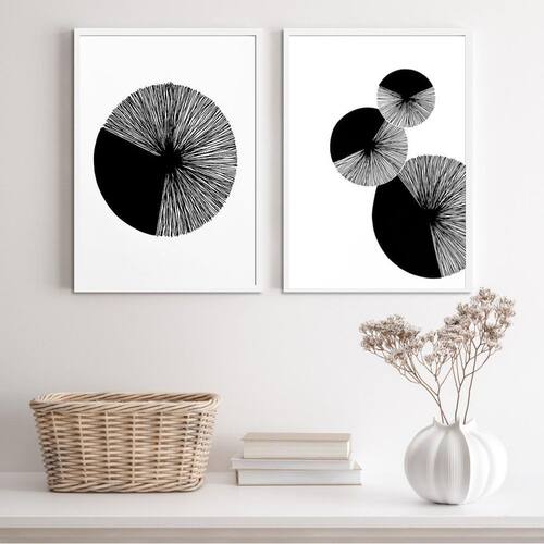 Especificações técnicas: - Kit contendo 2 quadros minimalistas - Design: círculos com efeito textura - Moldura: madeira branca - Material do papel: papel fotográfico brilhante de altíssima resolução - Medidas de cada peça: 33x24cm A4 - Acompanha película de acetato para proteção da imagem - Embalagem com plástico bolha para garantir a segurança dos quadros durante o transporte