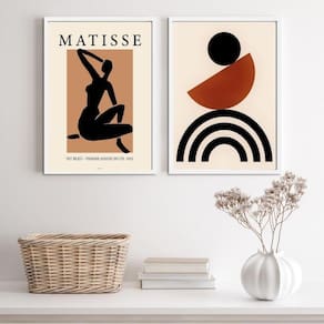 A moldura dos quadros é feita em madeira branca, o que confere um acabamento elegante e sofisticado. A combinação do marrom com o preto na arte Matisse traz um contraste moderno e atemporal, perfeito para qualquer estilo de decoração.
