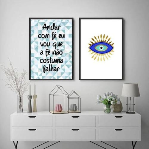 Kit 2 quadros olho grego andar com fé 45x34cm - com vidro Moldura: madeira preta Informações do produto tire todas as suas dúvidas no descritivo abaixo: decoração para quarto, sala, cozinha, escritório, área gourmet e muito mais. Chega de paredes vazias medidas - cada peça tem 45x34cm a3 . Material do papel - papel fotográfico brilhante de altíssima resolução acabamento - todos os quadros são acompanhados de vidro para proteção da imagem. - moldura em madeira maciça na cor preta e pendurador . - os quadros são embalados de forma segura com plástico bolha com camada dupla de acordo com o tamanho dos quadros. - de 3 meses. Meu quadro chegou. Como posso fixá-lo Você precisa apenas de um martelo e um prego, pois os quadros já vão acompanhados de penduradores. Esta é a forma mais indicada. Como posso limpar meu quadro A limpeza é feita como um móvel comum da sua casa. Apenas um pano seco ou espanador são suficientes para tal