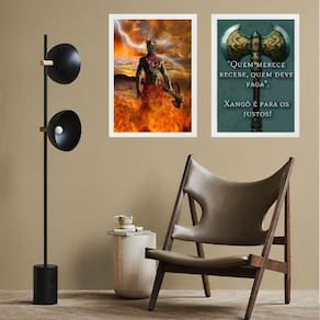 Kit 2 quadros orixá xangô - justiça 45x34cm - com vidro Moldura: madeira branca Informações do produto tire todas as suas dúvidas no descritivo abaixo: decoração para quarto, sala, cozinha, escritório, área gourmet e muito mais. Chega de paredes vazias medidas - cada peça tem 45x34cm a3 . Material do papel - papel fotográfico brilhante de altíssima resolução acabamento - todos os quadros são acompanhados de vidro para proteção da imagem. - moldura em madeira maciça na cor preta ou branca conforme produto escolhido e pendurador . - os quadros são embalados de forma segura com plástico bolha com camada dupla de acordo com o tamanho dos quadros. Garantia - garantia de 3 meses. Meu quadro chegou. Como posso fixá-lo Você precisa apenas de um martelo e um prego, pois os quadros já vão acompanhados de penduradores. Esta é a forma mais indicada. Como posso limpar meu quadro A limpeza é feita como um móvel comum da sua casa. Apenas um pano seco ou espanador são suficientes para tal Ean: 7890409279045